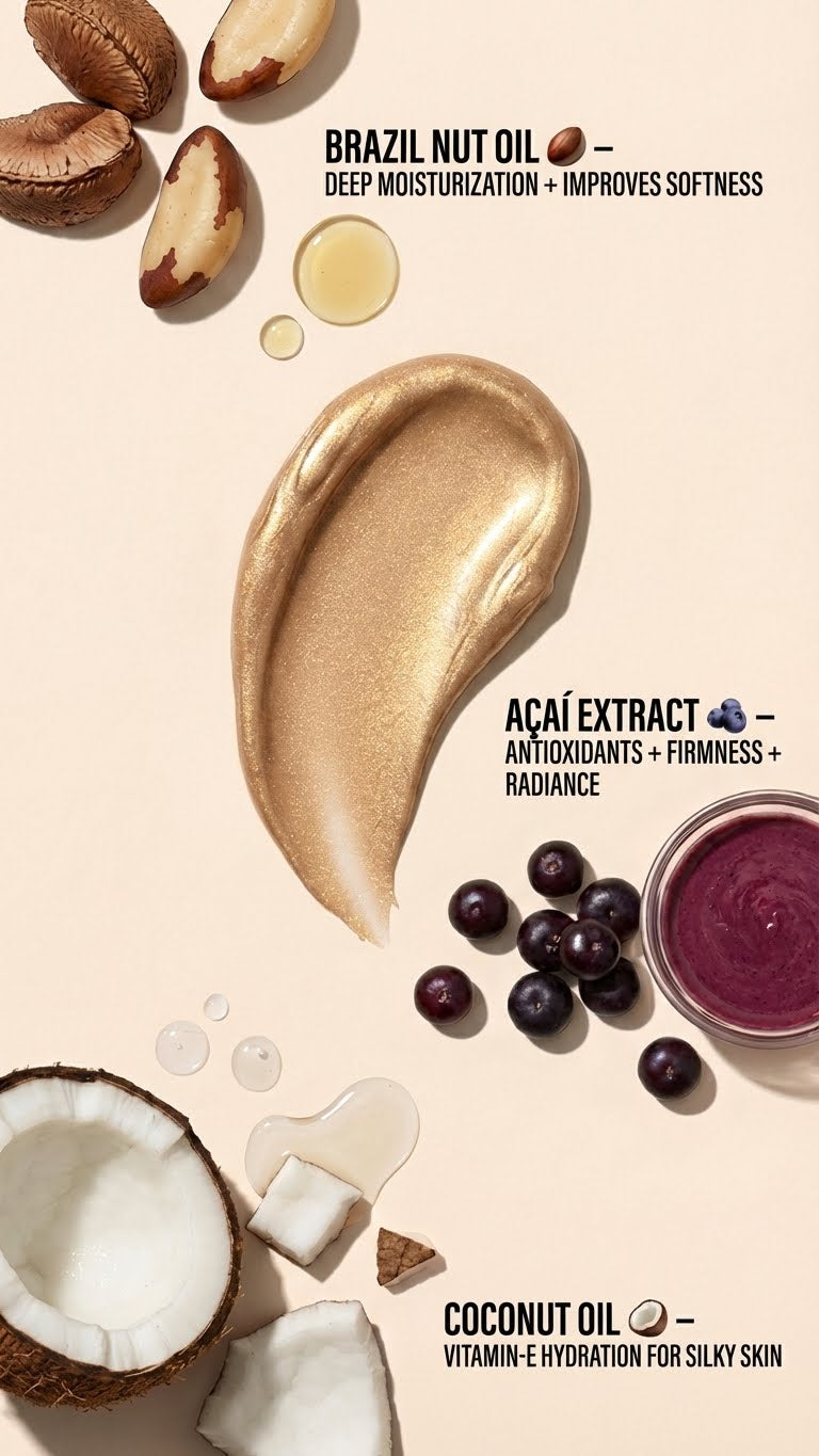 Ingredients: Water (Aqua), Mica, Titanium Dioxide, Stearic Acid, Sorbitol, Soybean Glycerides, Iron Oxide Red, Glyceryl Stearate, Cocos Nucifera Oil, Caprylic/Capric Triglyceride, Magnesium Aluminum Silicate, Fragrance, Butyrospermum Parkii Butter Unsaponifiables, Triheptanoin, Phenoxyethanol, Cetyl Alcohol, Tocopheryl Acetate, C13-15 Alkane,Xanthan Gum,Glycerin, Bertholletia Excelsa Seed Extract, Euterpe Oleracea Fruit Extract (Açai), Alcohol, Tin Oxide, Ethylhexylglycerin, Triethanolamine, Hexyl Cinnamal,Linalool, D-Limonene, Benzyl Salicylate, Citronellol, Sorbitan Oleate Decylglucoside Crosspolymer, Benzyl Alcohol, Geraniol, Amyl Cinnamal, Benzoic Acid, Dehydroacetic Acid, Ascorbyl Palmitate, Citric Acid.